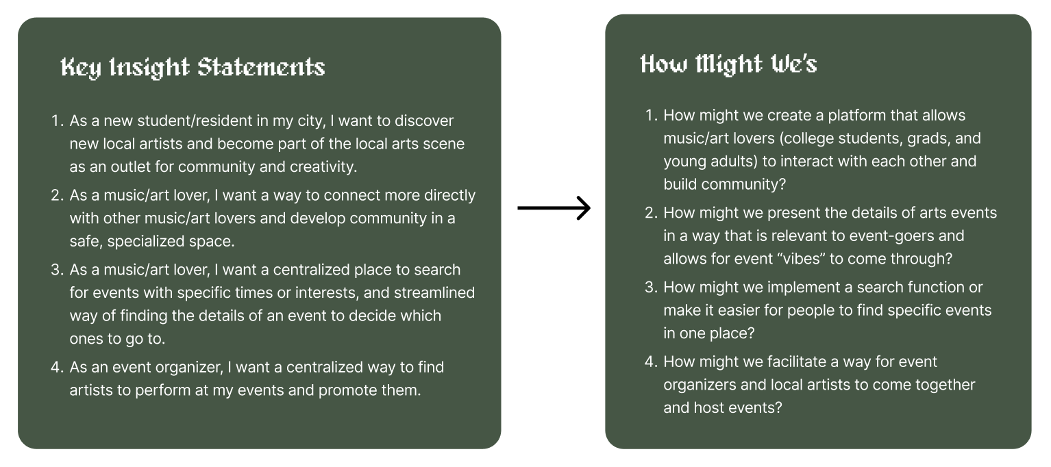 I developed a series of insight statements that examined specifically what users would want out of the platform. Transforming these into how might we’s allowed for a concrete design direction to emerge that would streamline searches for small arts events, promote online community-building, and encourage connectivity among users.
